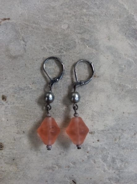Brinco em clip grafite com pingente em rosa fosco e pérola cinza