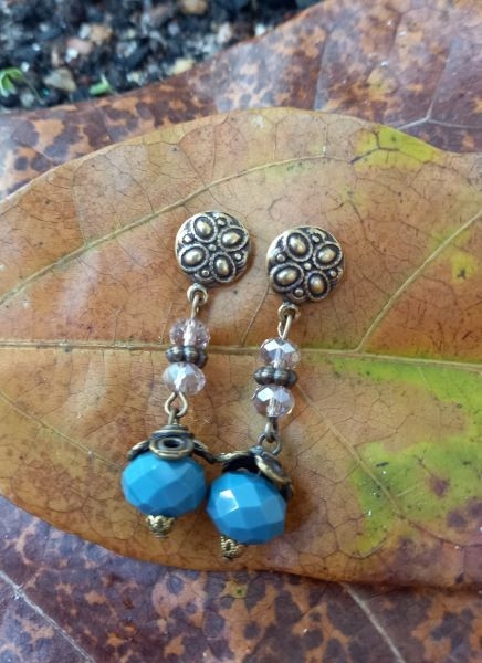 Brinco de pino com cristais e peças em ouro velho. Medidas : 4,5 cm. Ref 10105040