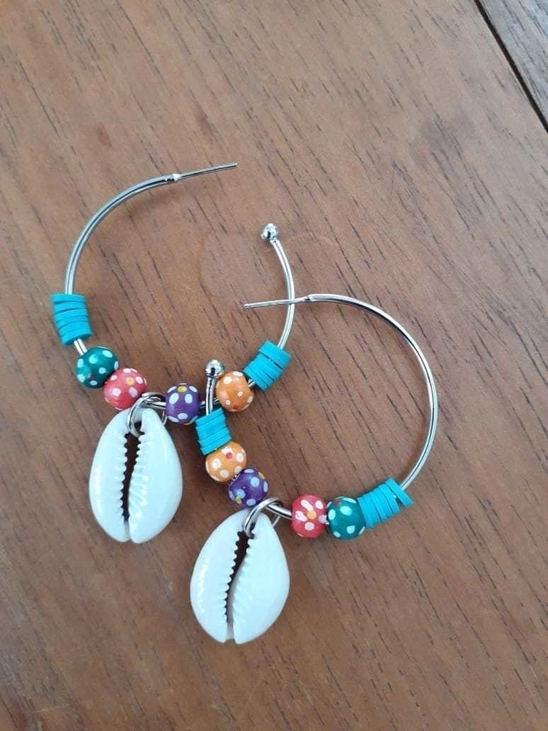 Argola com 4 cm de diâmetro com contas de madeira e fimo, no centro um búzios natural. Ref 10105015